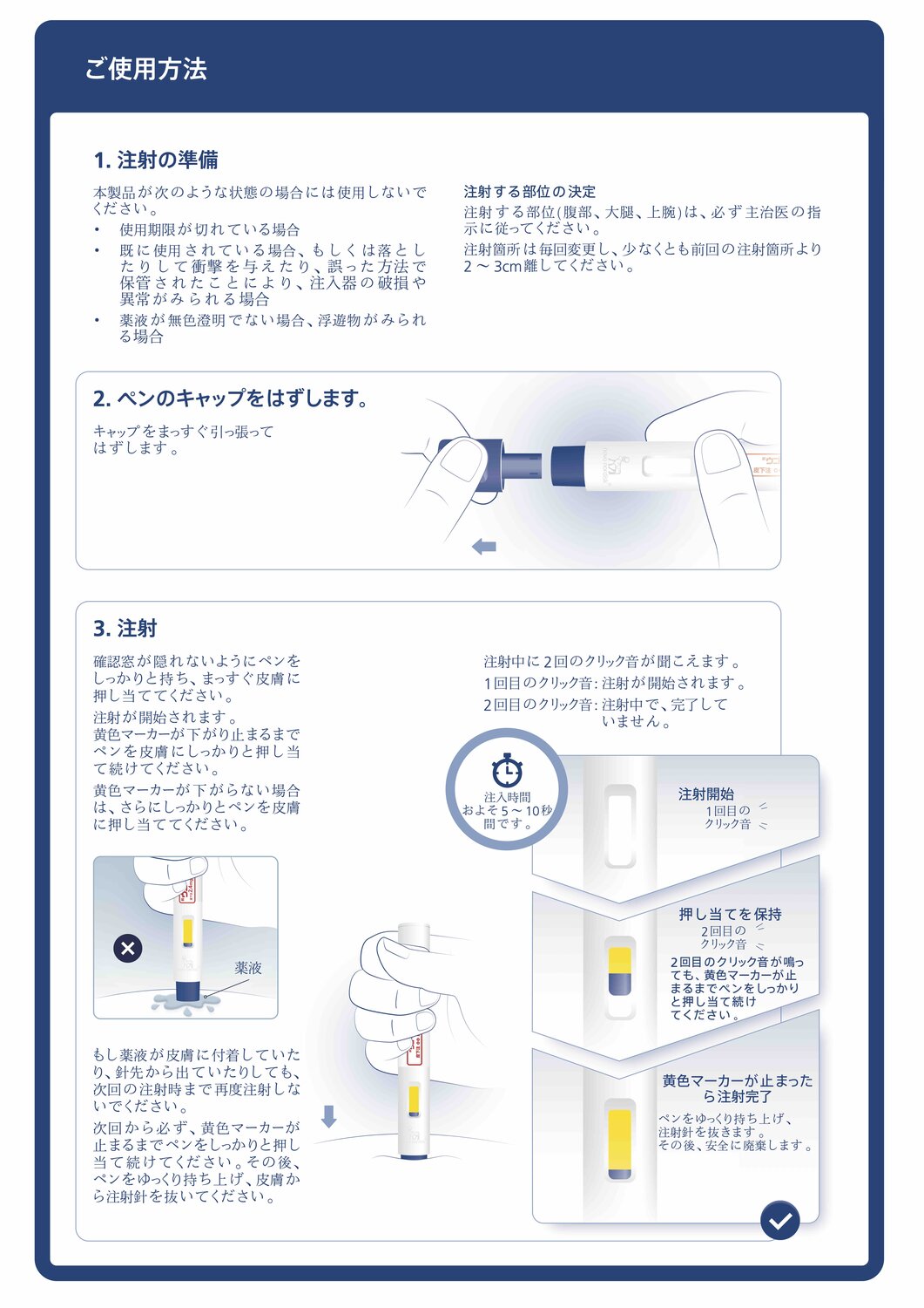 ・週に1回、毎週決まった曜日に注射してください。時間帯や食事の有無に関係なく使用できます。