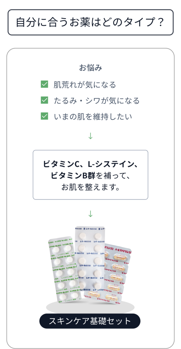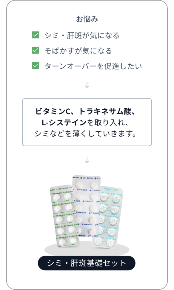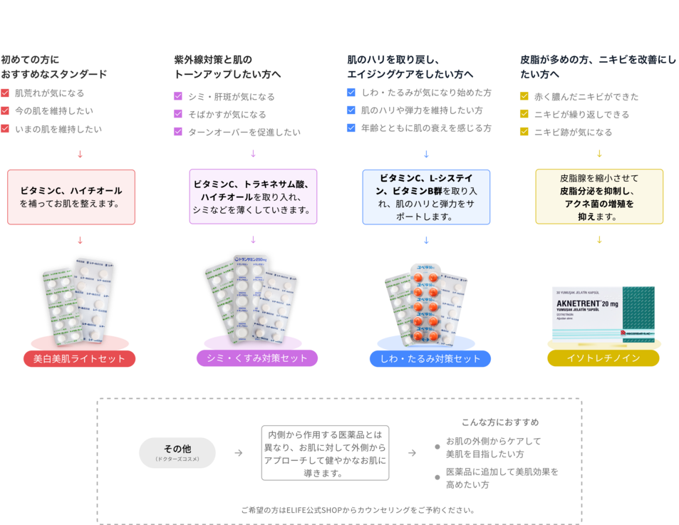 elifeでは、既存の基礎セットに加えて、ご自身のお悩みやご要望に合わせてお薬を組み合わせていただけます。
